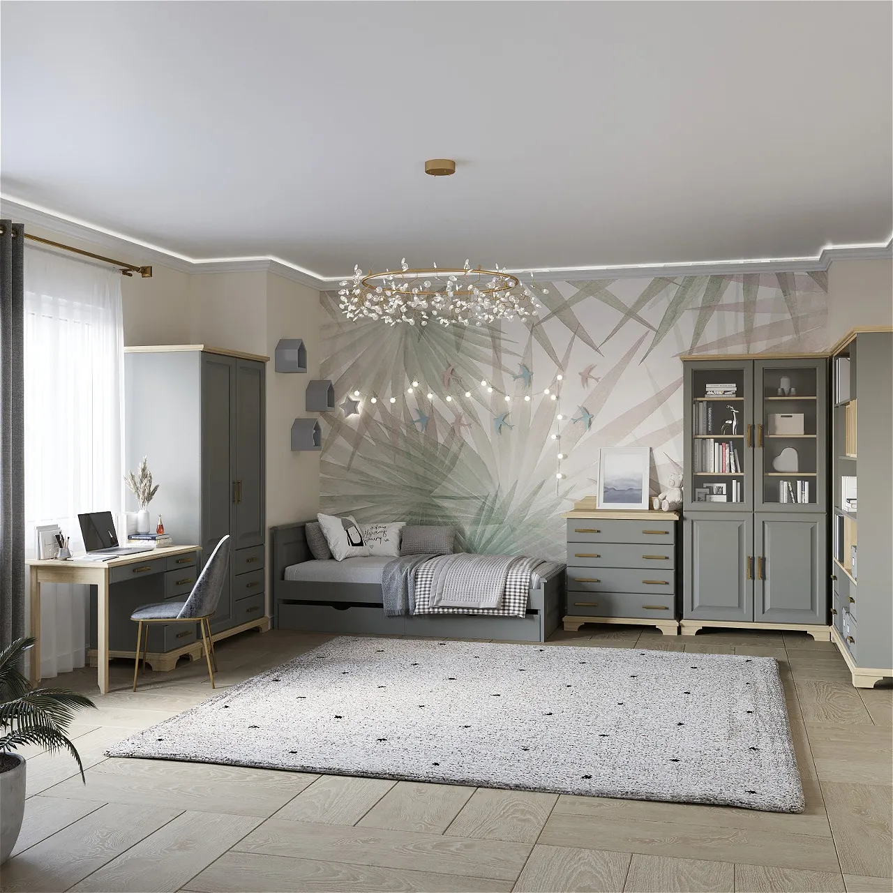 Мебель для детской «Брусно» привлекает внимание гармоничным дизайном, красивыми цветами и оригинальной фурнитурой. Мебель создаст в комнате спокойную уютную атмосферу, оптимальную и для игр, и для учебы. Здесь представлены остекленные шкафы для книг, сундуки, навесные полки, комоды с ящиками, бельевые шкафы и антресоли, письменные столы, односпальные кровати, прикроватные тумбы.