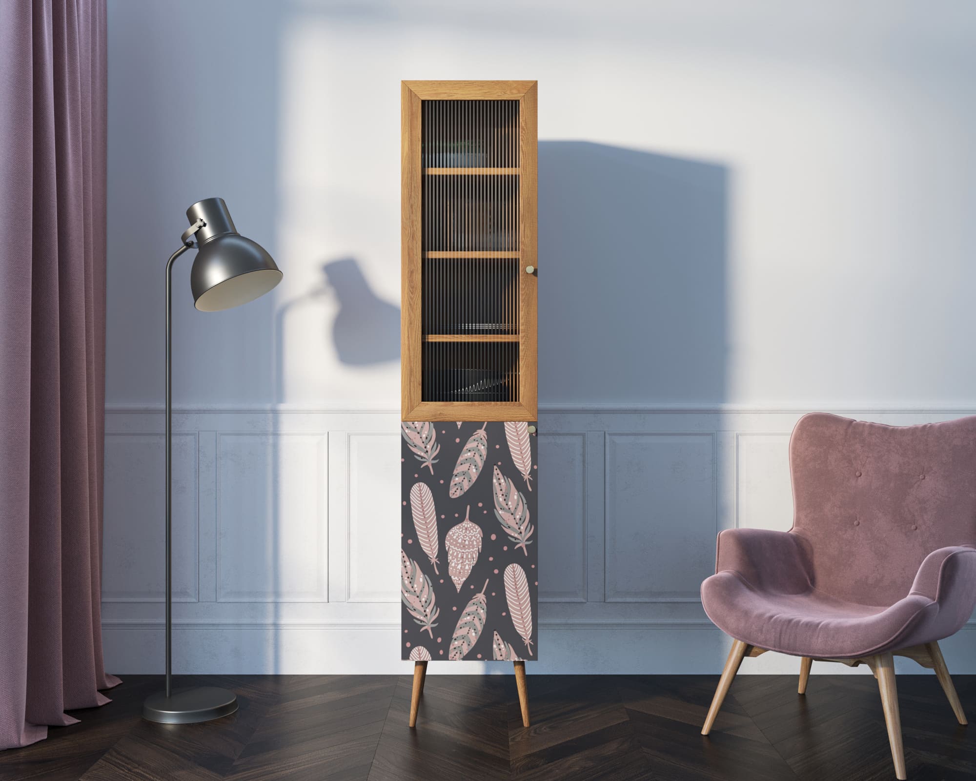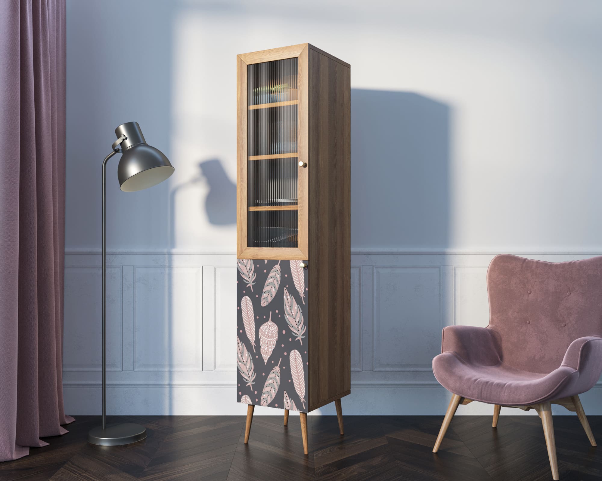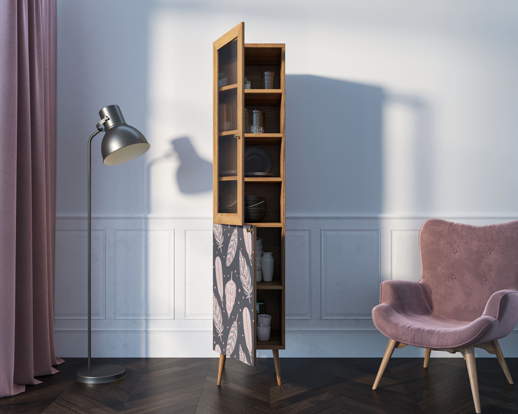 Буфет с дверцей. Буфет «Berber» узкий может использоваться совместно с другими элементами из одноименной коллекции или в качестве самостоятельного предмета мебели. Верхняя часть декорирована при помощи рифленого матового стекла, что создает дымчатый, интригующий эффект и параллельно скрывает детали содержания от взглядов, оставляя на виду только очертания форм. Нижний фасад украшен современным стильным принтом. Внутри буфета находятся шесть полок для посуды или книг.