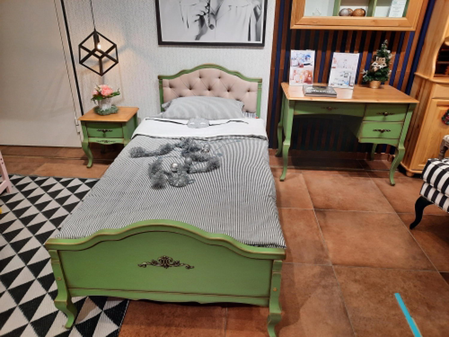 Мебель для детской «Ари-Прованс» из массива сосны привлекает внимание красивыми гнутыми ножками «кабриоль», фасадами с филенками и виньетками, а также интересной фурнитурой из состаренного металла. В коллекции есть письменные столы, книжные и бельевые шкафы, комоды, стеллажи с открытыми полками, односпальные кровати, прикроватные тумбы, зеркала.