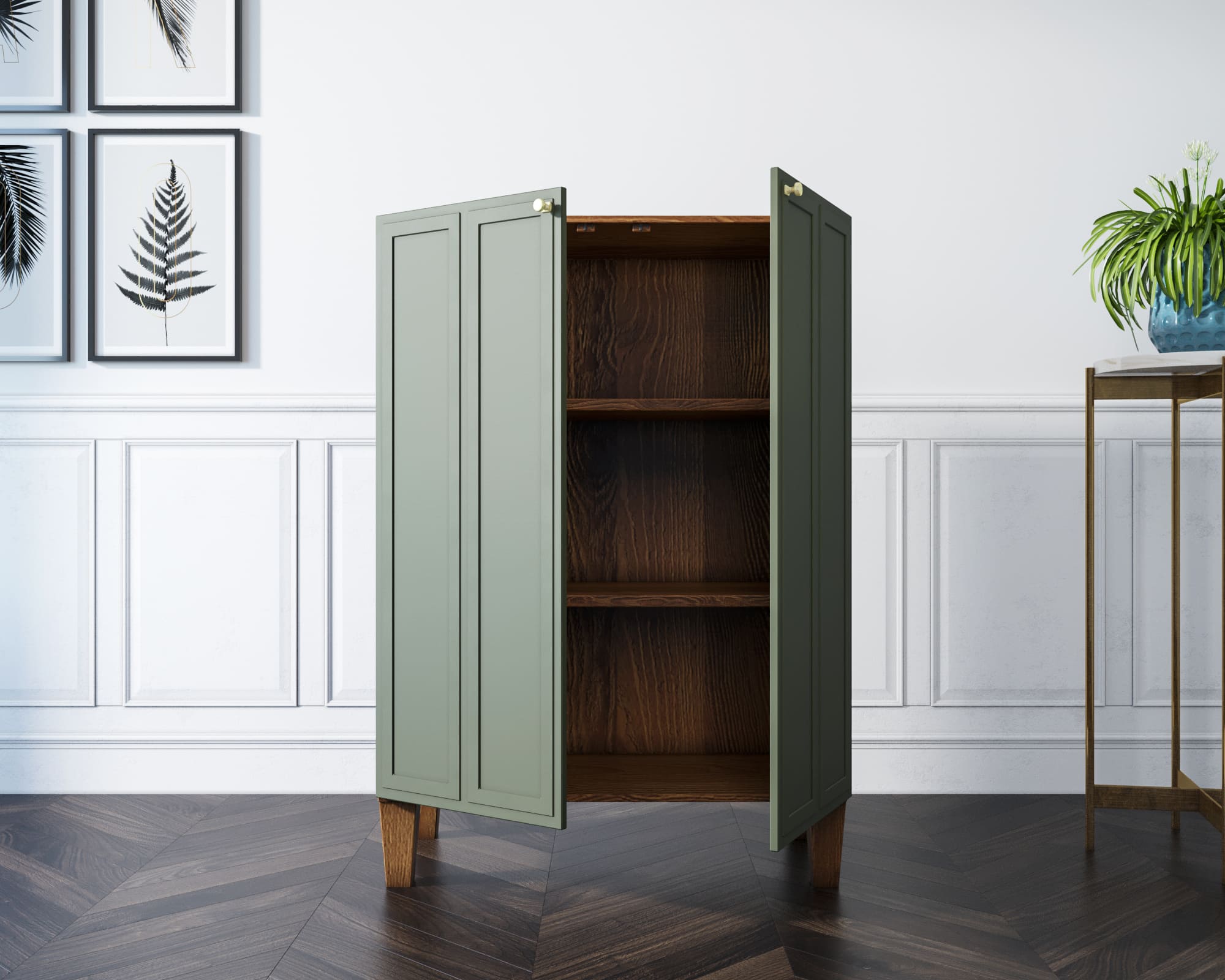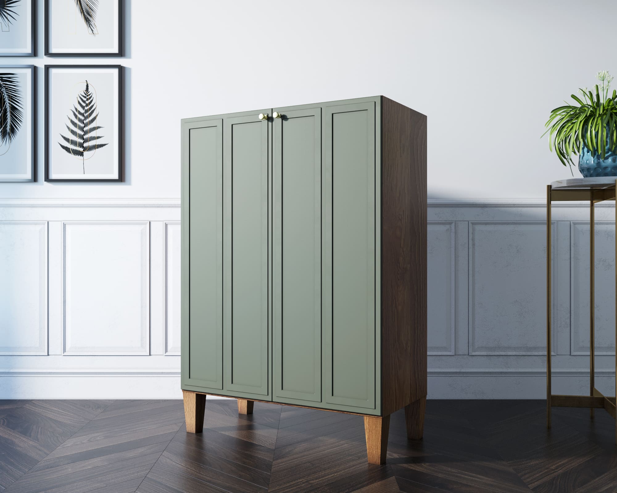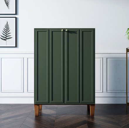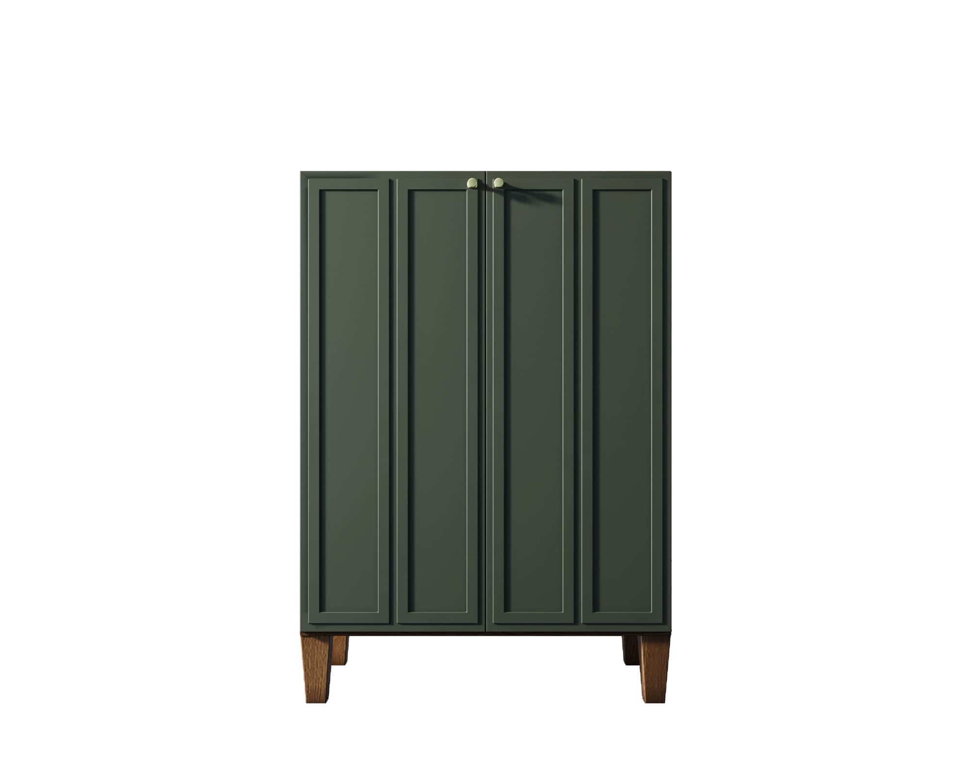 Основательность конструкции придают фасады с прямыми рамками и ножки из массива ясеня в цвете орех. Фасады имеют приятный зеленый оттенок.