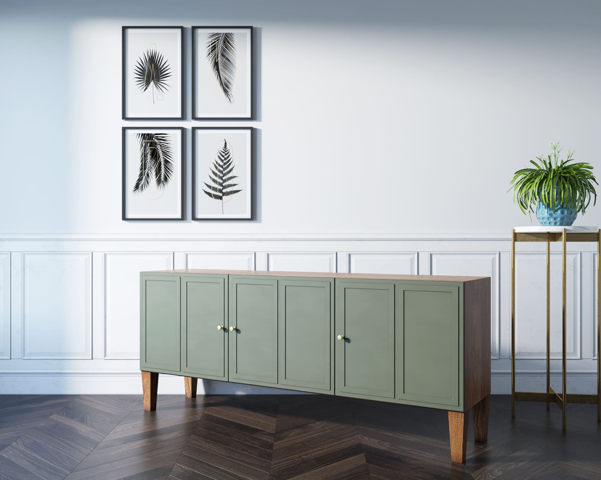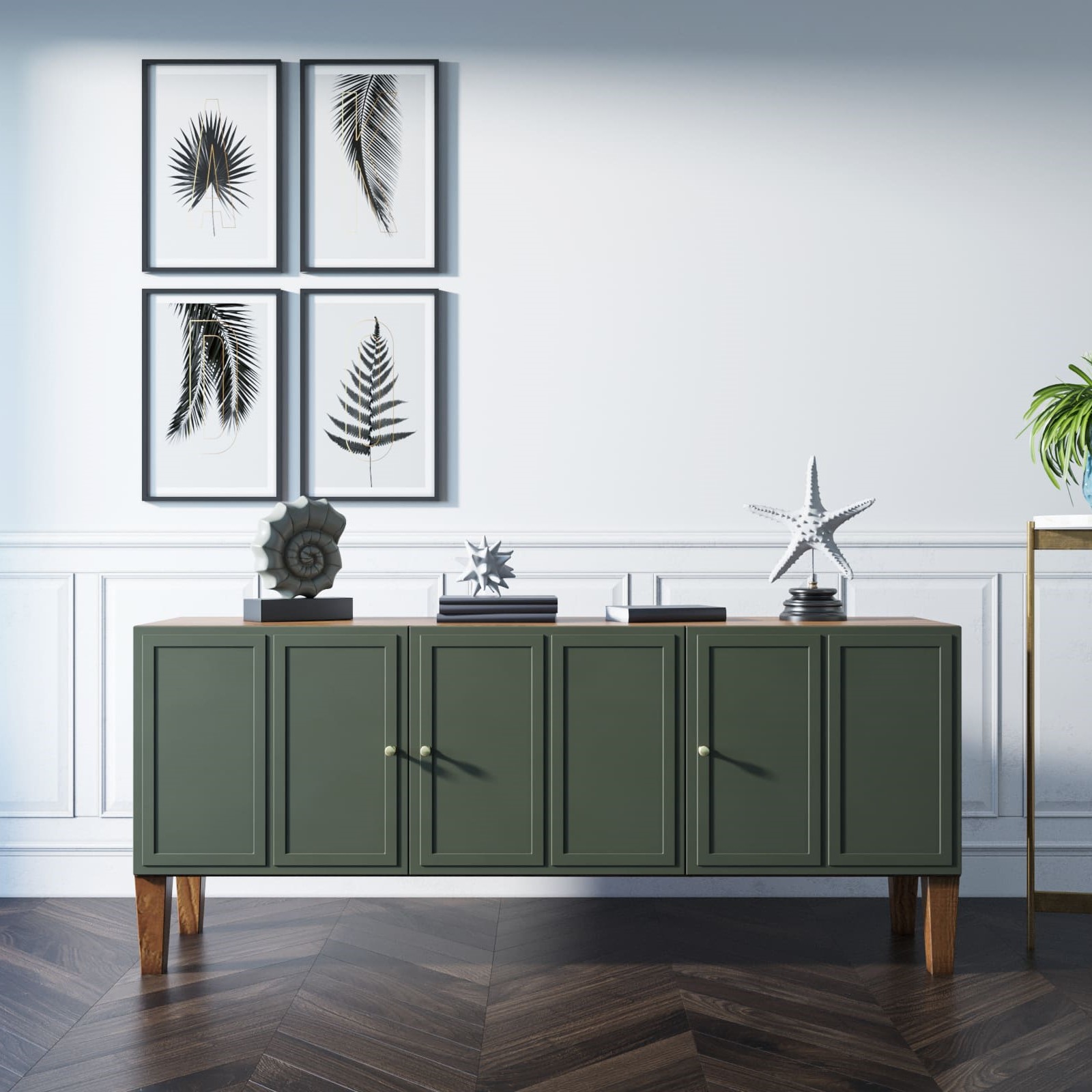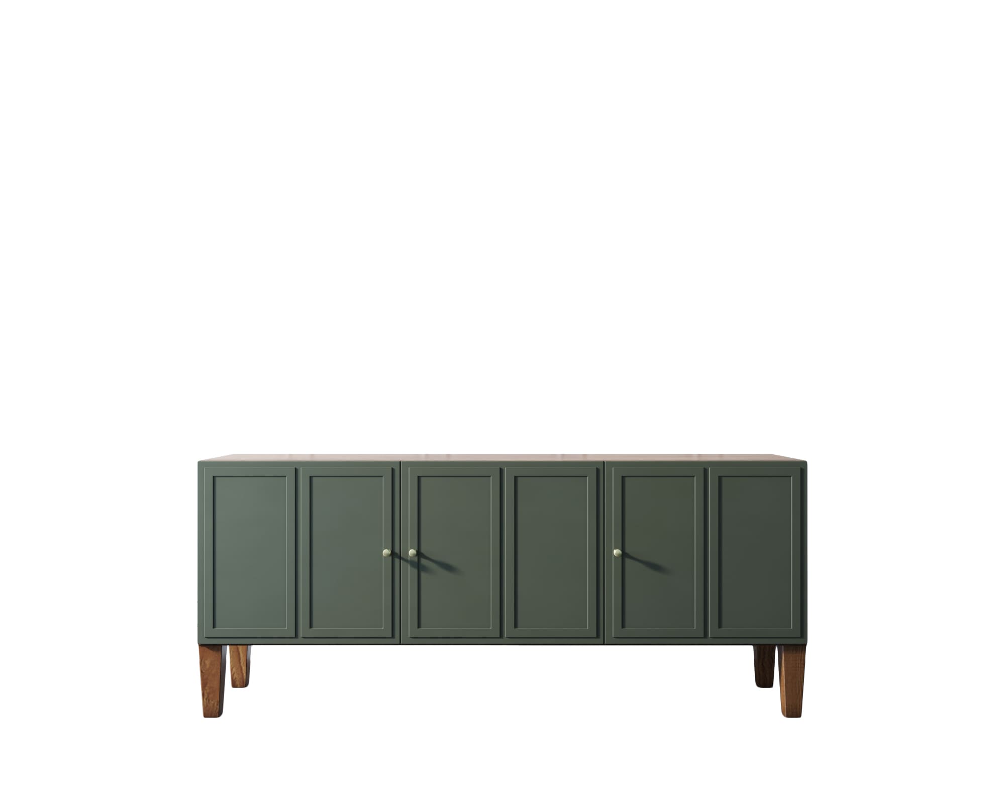 Основательность конструкции придают фасады с прямыми рамками и ножки из массива ясеня в цвете орех.