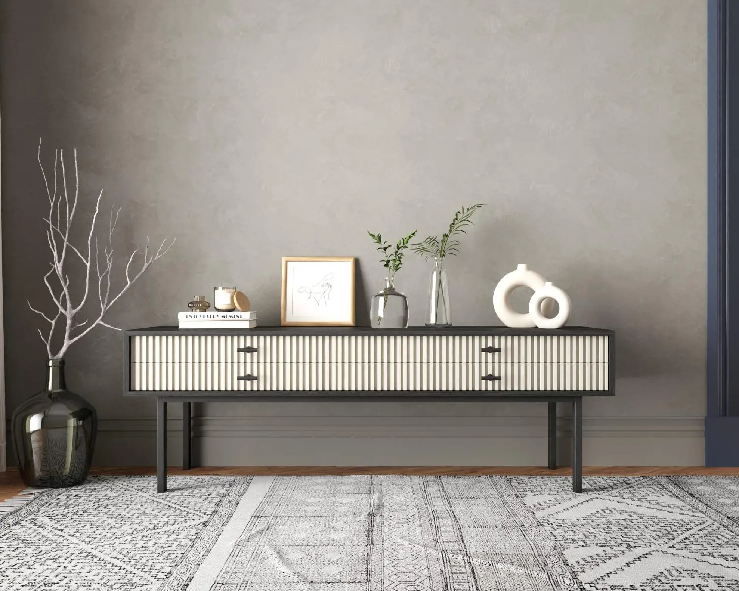 Эта консоль имеет металлические ручки, которые придают ей современный вид. Она может служить как туалетный стол или тумба под телевизор, что делает её универсальным решением для вашей комнаты.