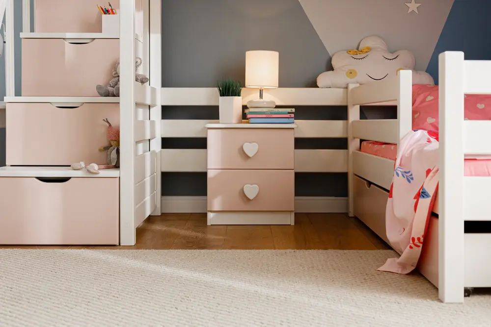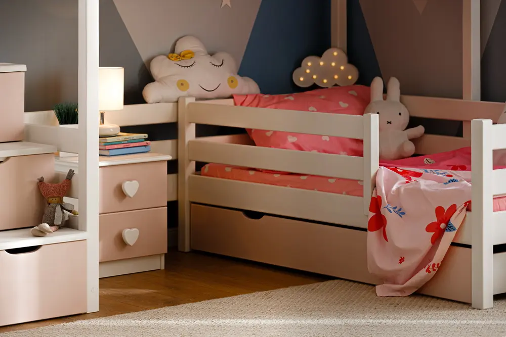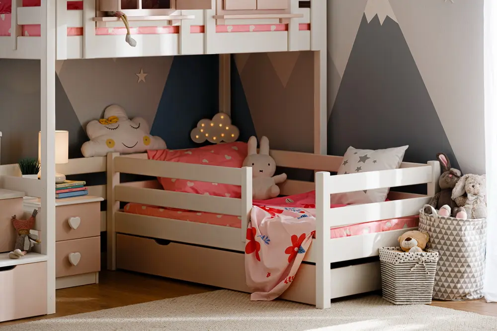 Ящики не входят в комплект кровати и заказываются отдельно. Мы предлагаем ящики разных размеров и цветов. Ящики изготовлены из массива сосны и оснащены роликовыми направляющими. Они легко выдвигаются и задвигаются, а также имеют плавный ход.