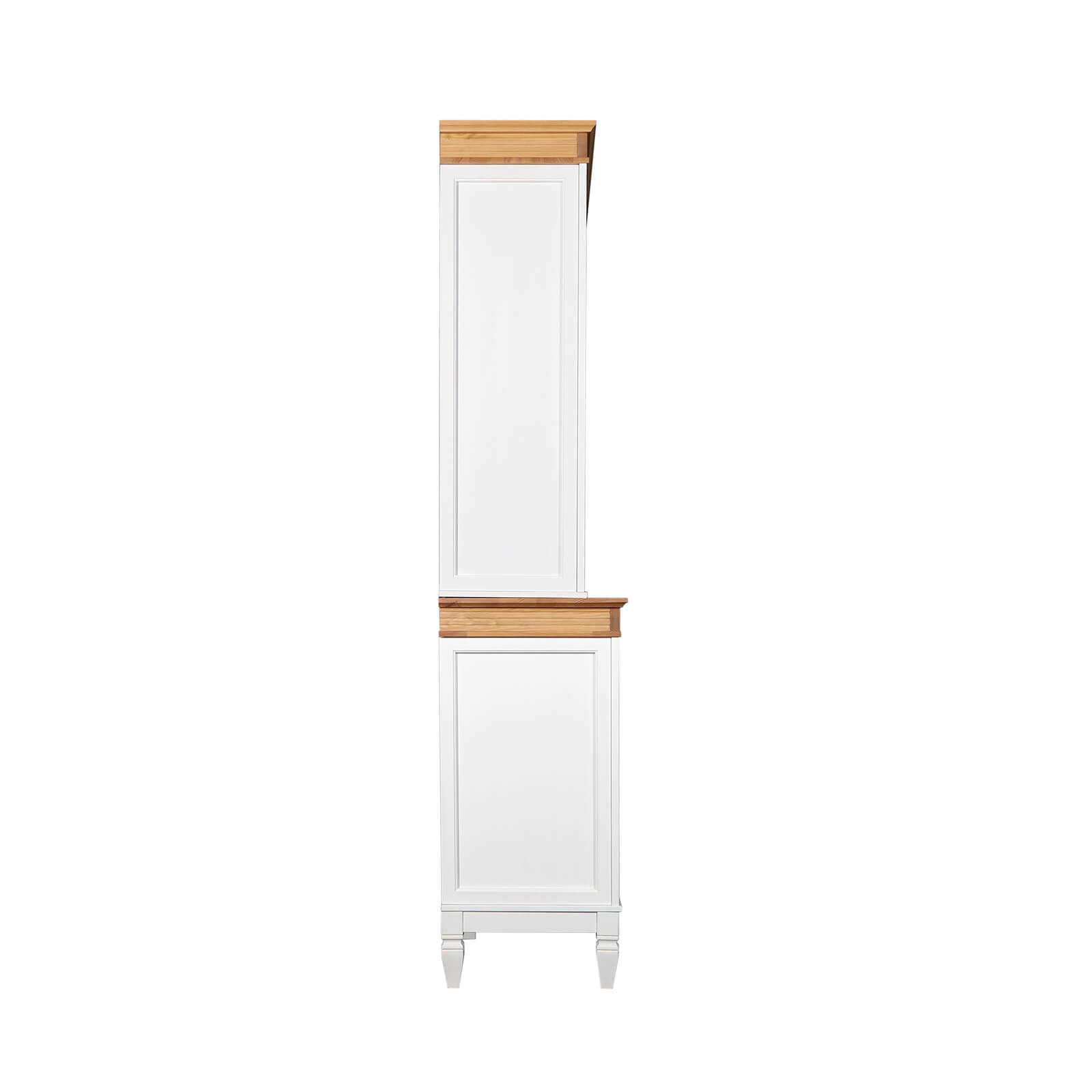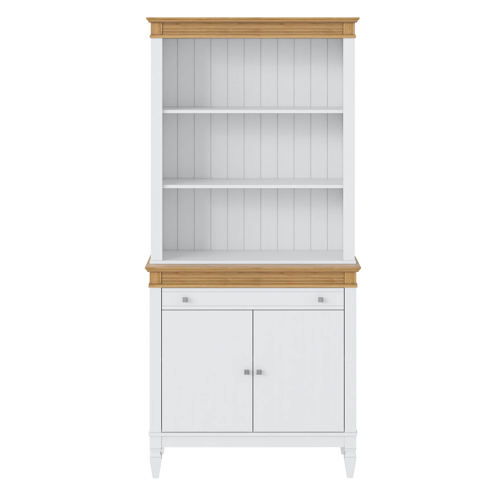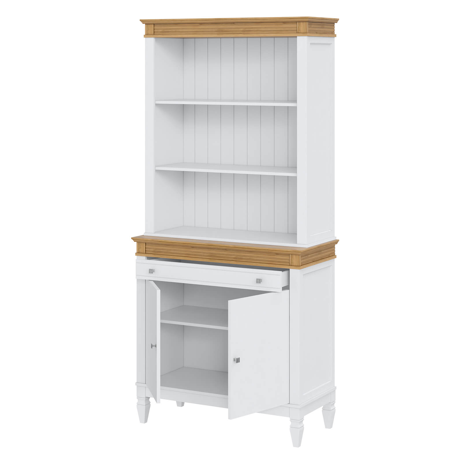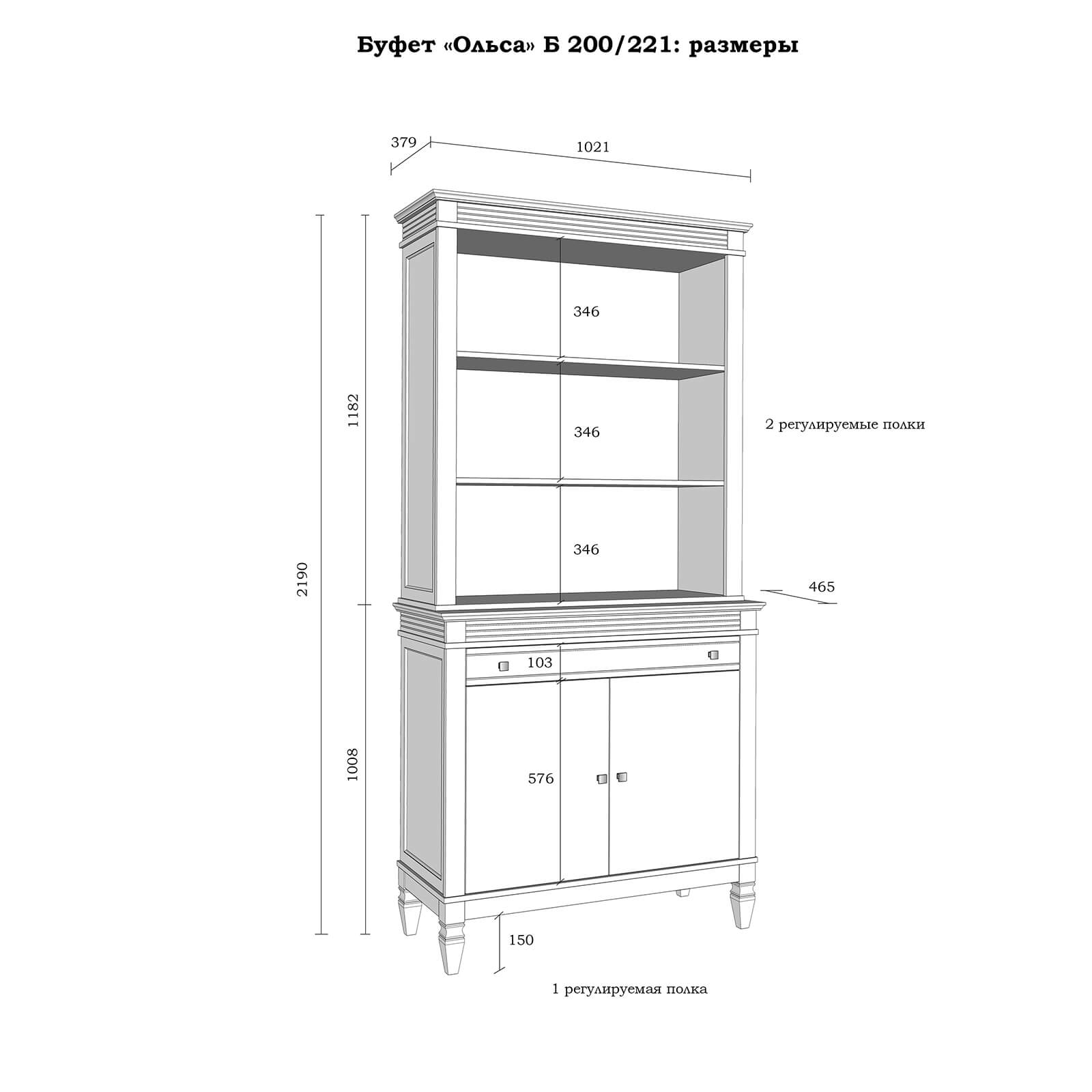Буфет укомплектован двумя полками сверху, одной полкой снизу за распашными дверями и одним ящиком.