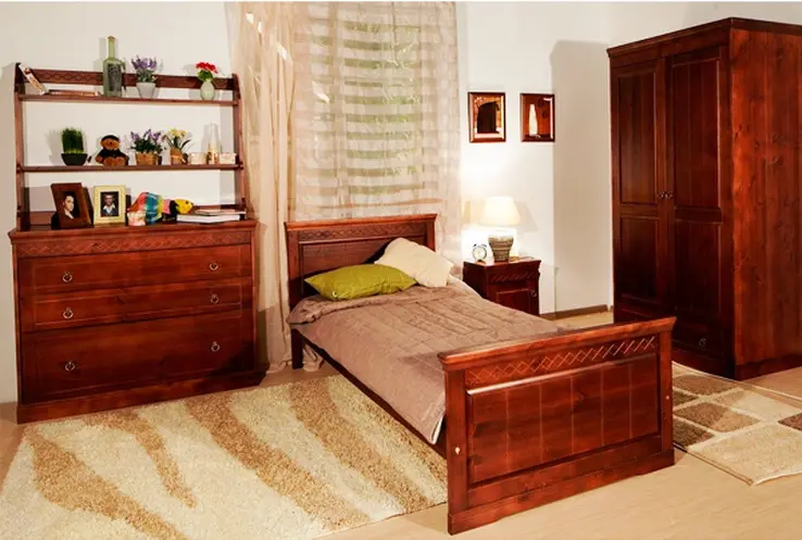 Мебель «Дания» изготавливается из массива сосны. После тонировки под покрытием остается видна естественная древесная текстура, включая сучки. По запросу корпус и фасады могут быть изготовлены из МДФ, без сучков. Задние стенки изделий и донья ящиков выполняются из ДВП. Ящики устанавливаются на шариковых направляющих с полным выдвижением, без доводчиков.