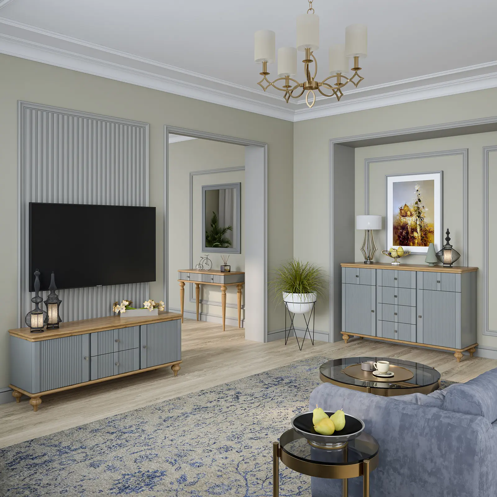 В этой популярной мебели для гостиной удачно сочетаются фасадные панели с фрезеровкой, оригинальные фигурные ножки-бочонки и квадратные ручки-кнопки с эффектом старения. В коллекцию входят комоды с дверцами и ящиками, журнальные столы, буфеты, витрины, тумбы ТВ, стеллажи с открытыми полками, настенные зеркала и полки.