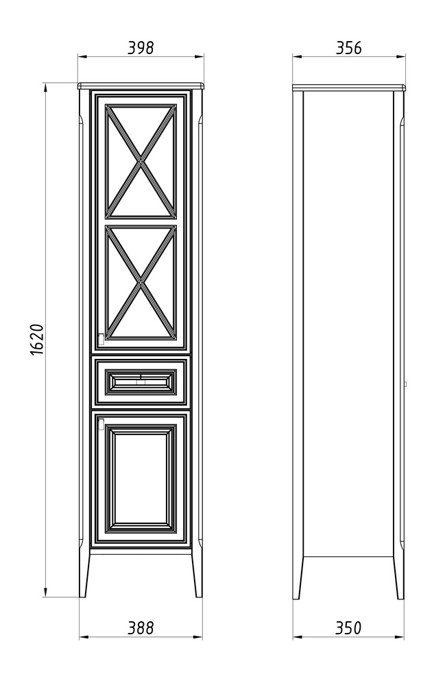 Верхний ящик тумбы разделён на 3 отсека для раскладывания предметов, в отделении с дверцами есть полка. Пенал имеет два отделения с дверцами, в верхнем установлены съёмные стеклянные полки. Кроме того, в пенале есть небольшой выдвижной ящик.