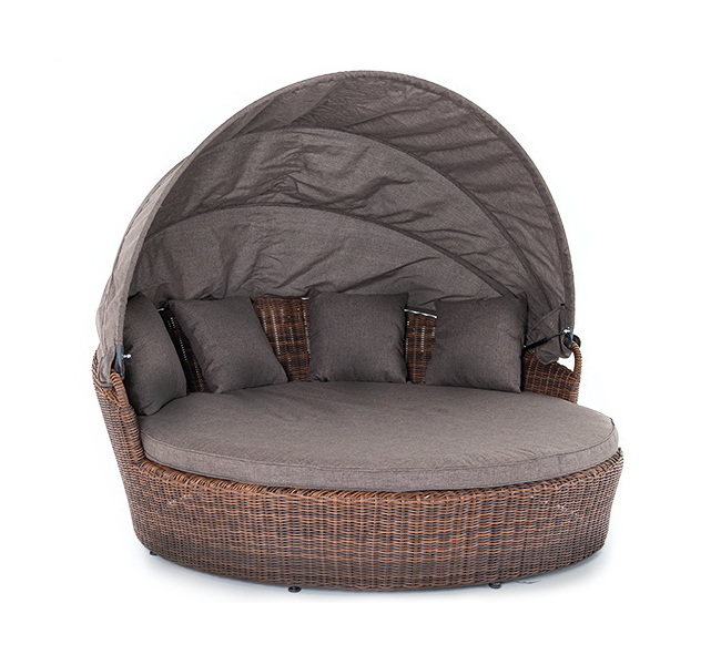 Круглая кровать из искусственного ротанга коричневого цвета "Стильяно" собрана на базе каркаса, выполненного из алюминия. Данная модель обладает диаметром 1800 мм и высотой в 700 мм, укомплектована матрасом и четырьмя подушками из полиэстера, плотностью 230гр/м2. Чехлы на подушках и матрасе с влагоотталкивающими свойствами, благодаря специальной пропитке. Кровать оборудована козырьком с возможностью его регулировки.