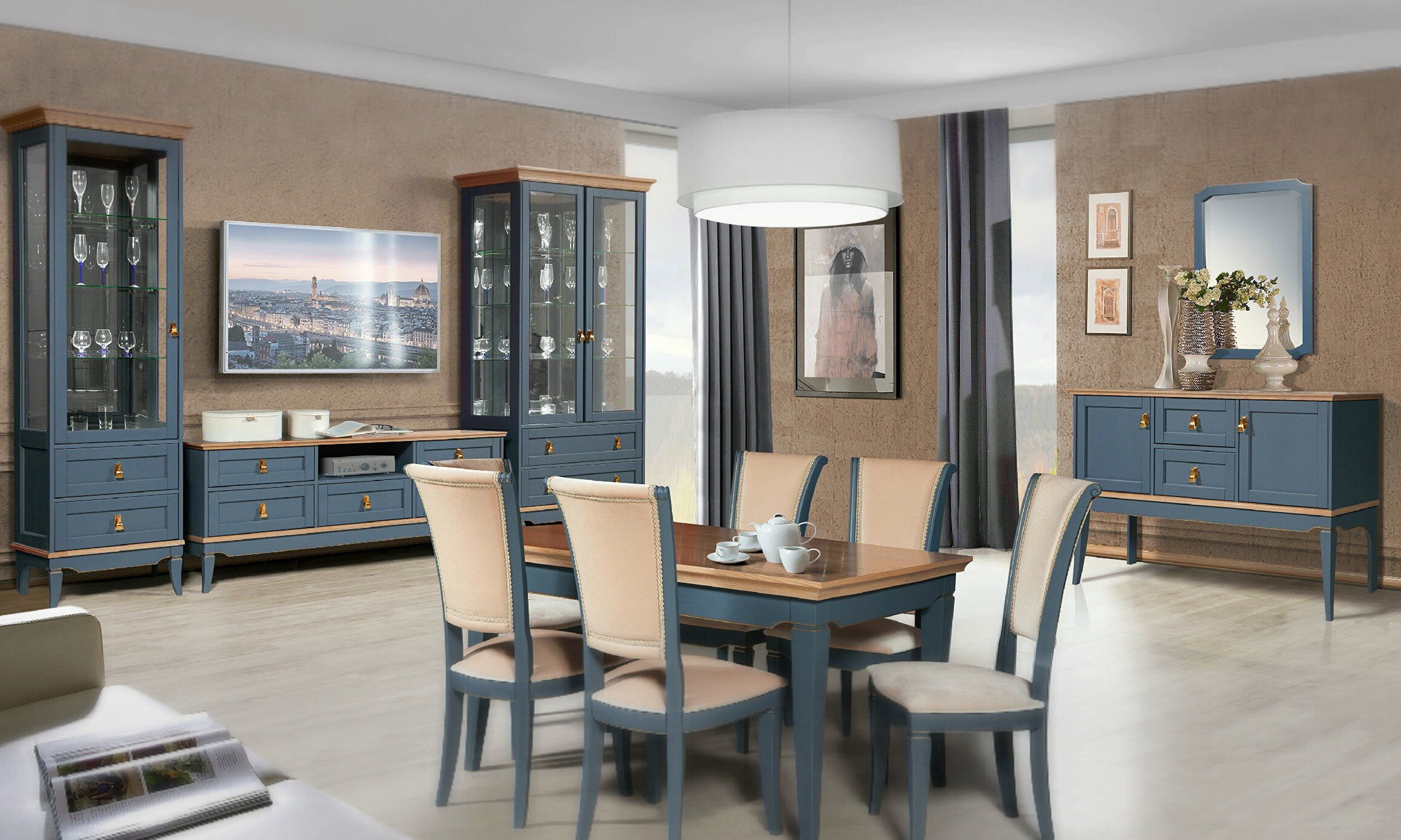 Коллекция включает шкафы, кровати, комоды, столы, пуфы и банкетки из натурального дерева. Для изготовления фасадов используют массив дуба, корпуса изготавливают из массива дуба и МДФ с облицовкой дубовым шпоном. На выбор два варианта отделки: «белый/натуральный дуб» и «капри/натуральный дуб».