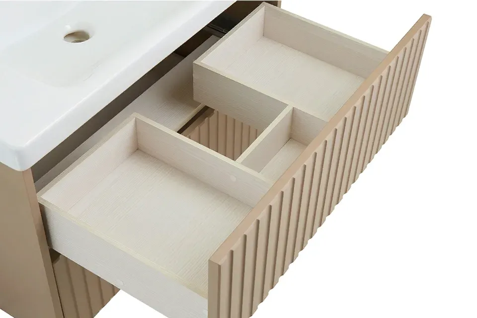 Тумба выполнена из высококачественных материалов, которые обеспечивают долговечность и надёжность конструкции. Корпус и фасады изготовлены из МДФ, а столешница выполнена из массива ясеня. Ручки-капли с влагостойким покрытием отлично подходят для ванной комнаты.
