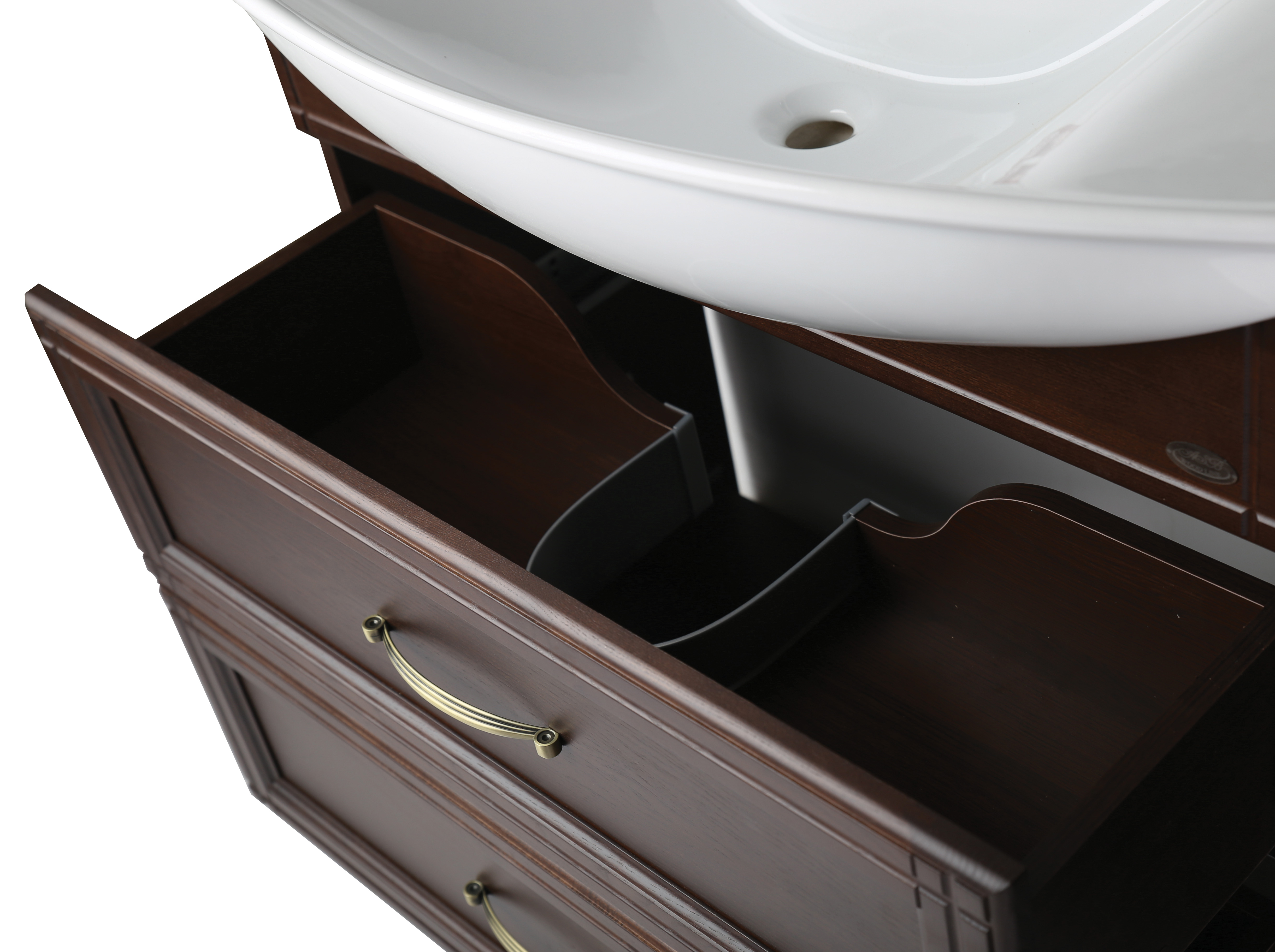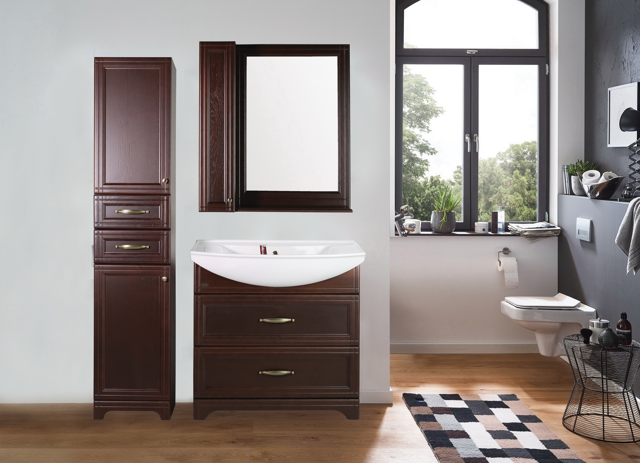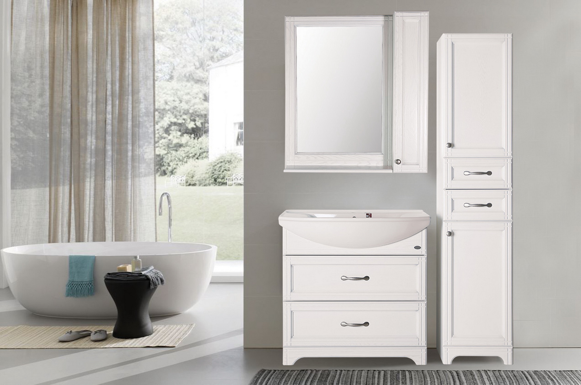 Коллекция «Берта» для ванных комнат включает в себя пенал с распашными дверцами и выдвижными ящиками, тумбу с дверцами и ящиком, керамическую раковину и зеркало в двух вариантах – с боковым шкафчиком или без шкафчика.