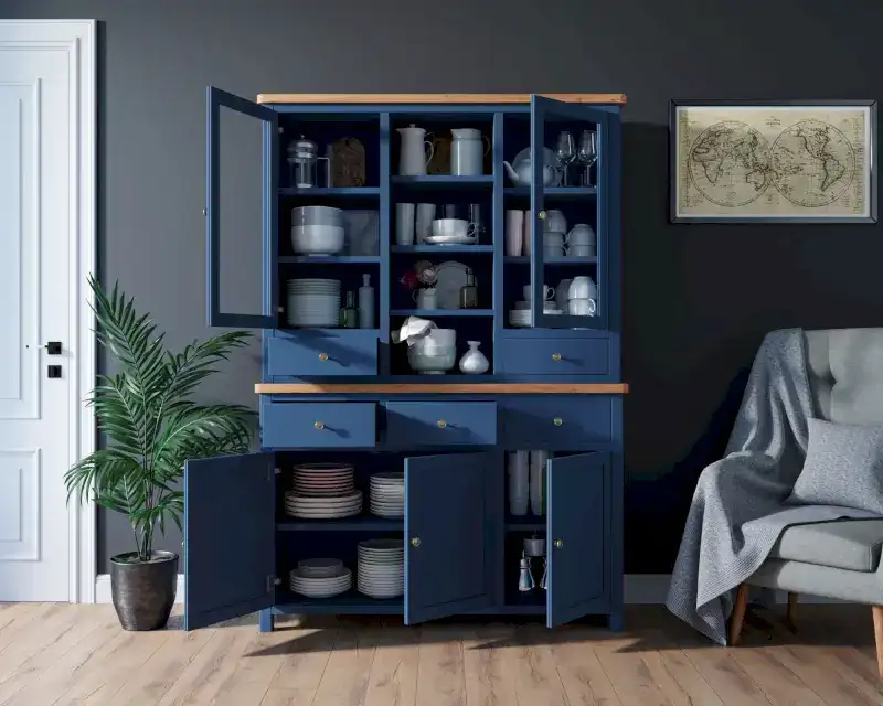 Мебель этой коллекции изготавливается из массива березы и массива ясеня, отдельные элементы выполняются из МДФ. Предлагается два базовых цвета – синий и серый, также возможна окраска по таблице RAL в любой выбранный цвет. Ящики и дверцы могут быть дополнительно оснащены доводчиками для плавного закрывания.